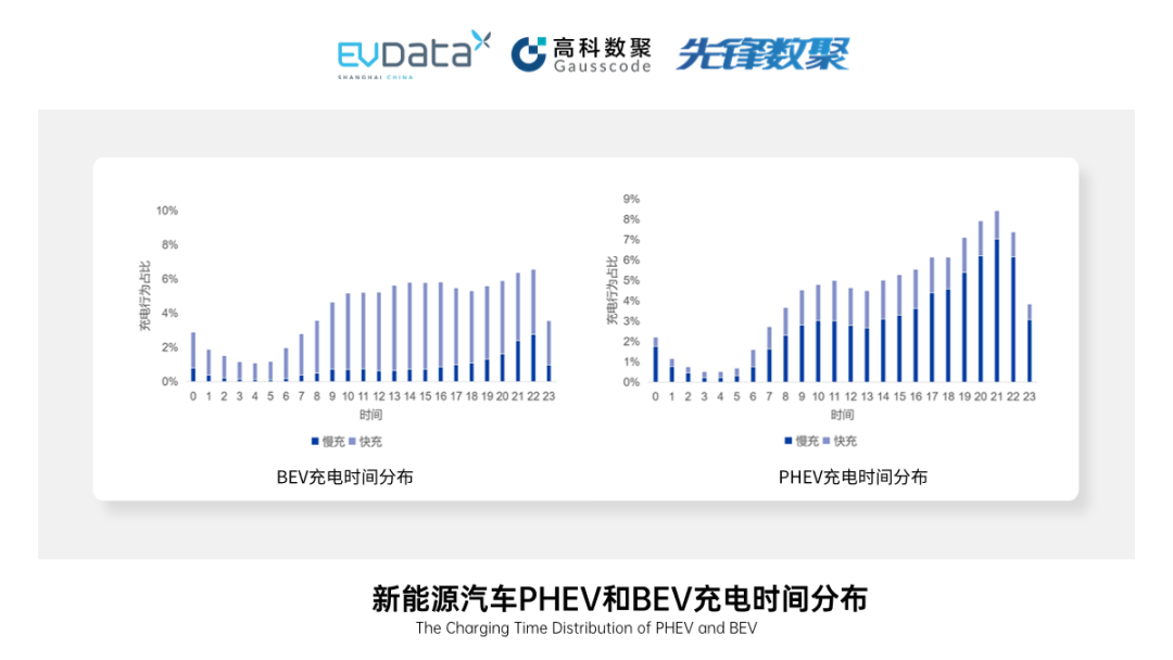 BEV和PHEV的充电差异还体现在了快慢充选择上。在短期出行过程中,BEV有79%的充电行为采用快充充电,同期PHEV有31%充电行为采用快充充电[5]。下图中,大部分充电情形下BEV车主选择了快充,约占全部充电次数的75%左右;即使选择慢充,其充电行为也主要发生在晚上18点以后,考虑到慢充补能时间较长,利用当天行程结束后的闲暇时间进行补能更为适宜。